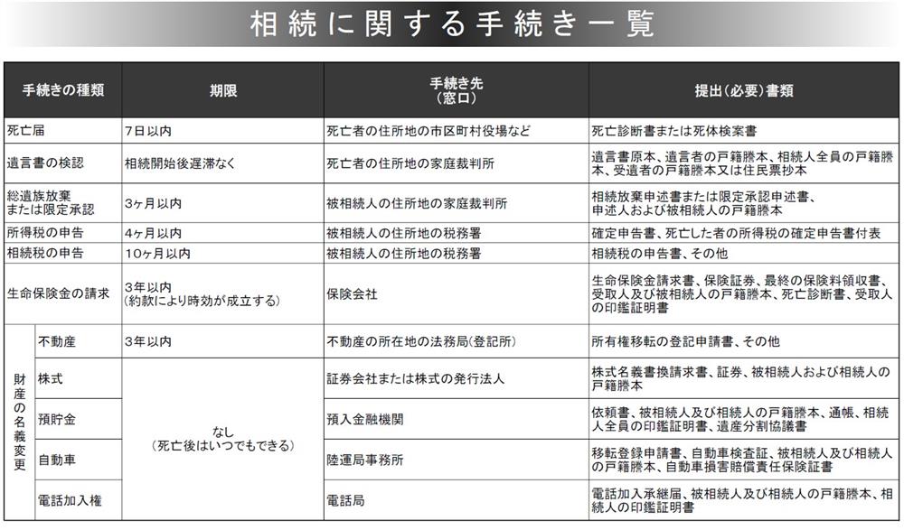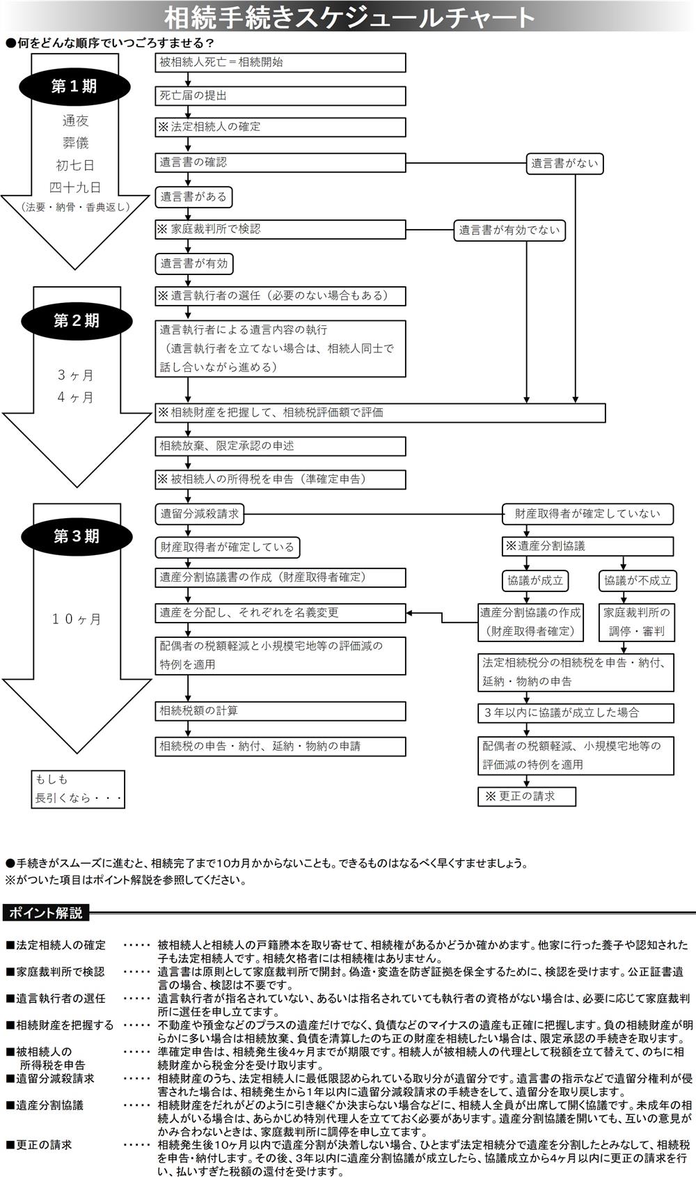 そもそも、相続の基本ルールを知らなければ、準備もできません。相続税は相続財産(※7年以内に贈与された財産を含む)が対象になりますが「3,000万円+(600万円✕法定相続人の数)」以下の額には課税されません。この「遺産に係る基礎控除額」や「相続手続き」(上図参照)のような相続に関する基本的な知識はきちんとおさえておく必要があります。
