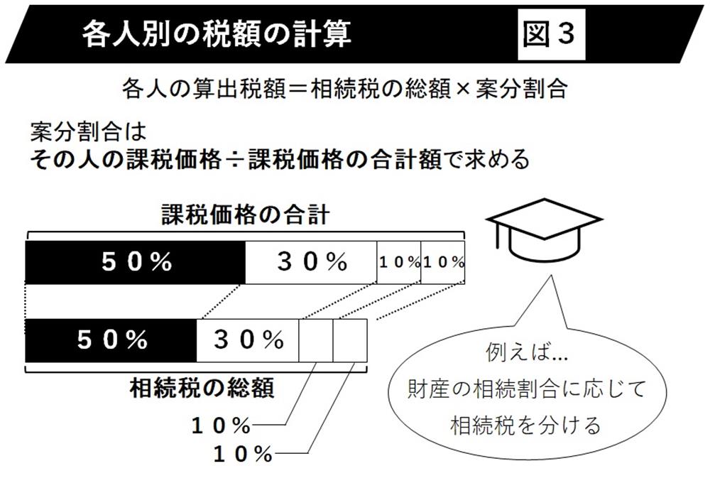 ポイント②で求めた相続税の総額を、それぞれの相続人が取得した財産の割合で案分します。<図3 各人別の税額の計算>参照