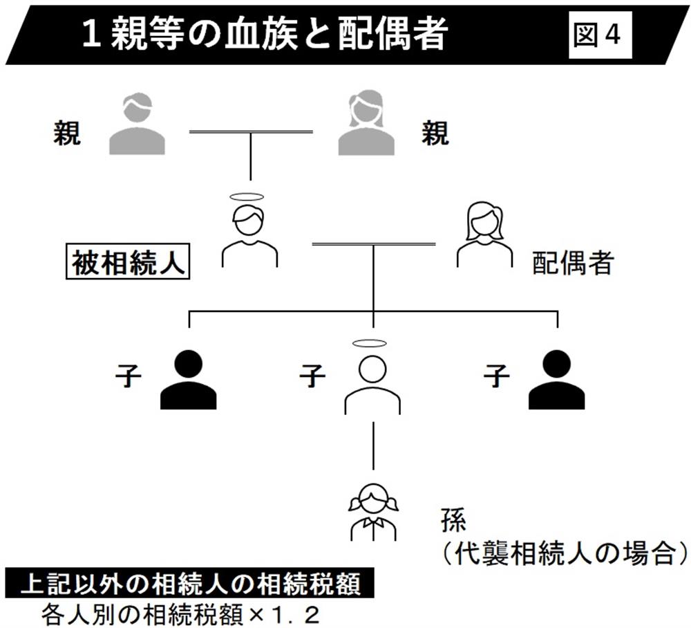 控除額を差し引く前にチェックしなければいけない項目に1親等の血族と配偶者以外の人が遺贈や相続を受けた場合、相続税額が2割加算されます。<図4参照>
